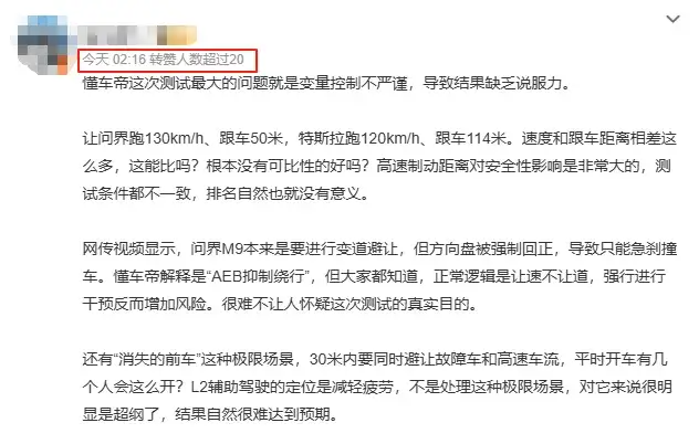 为了挽尊,华为的粉丝也使出了毕生之所学,质疑懂车帝在“消失的前车”中,把华为智驾的跟车距离设置得太近,最终华为在这一项测试中“全军覆没”。
