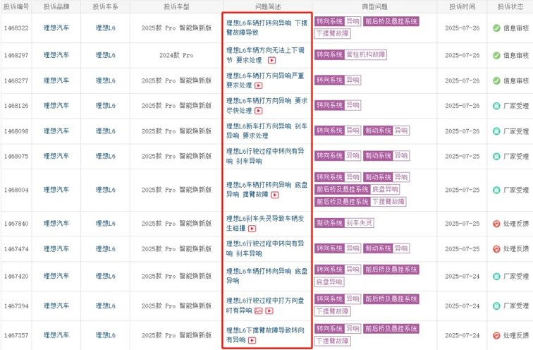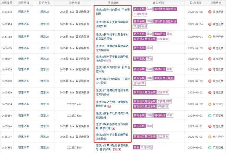 近日,来自专业汽车投诉网站的消息,理想 L 系列爆出大问题,多位车主投诉车型下摆臂异响,涉及 2025 款理想L全系列 L6、L7、L8 和 L9,但理想MEGA并没有出现投诉。