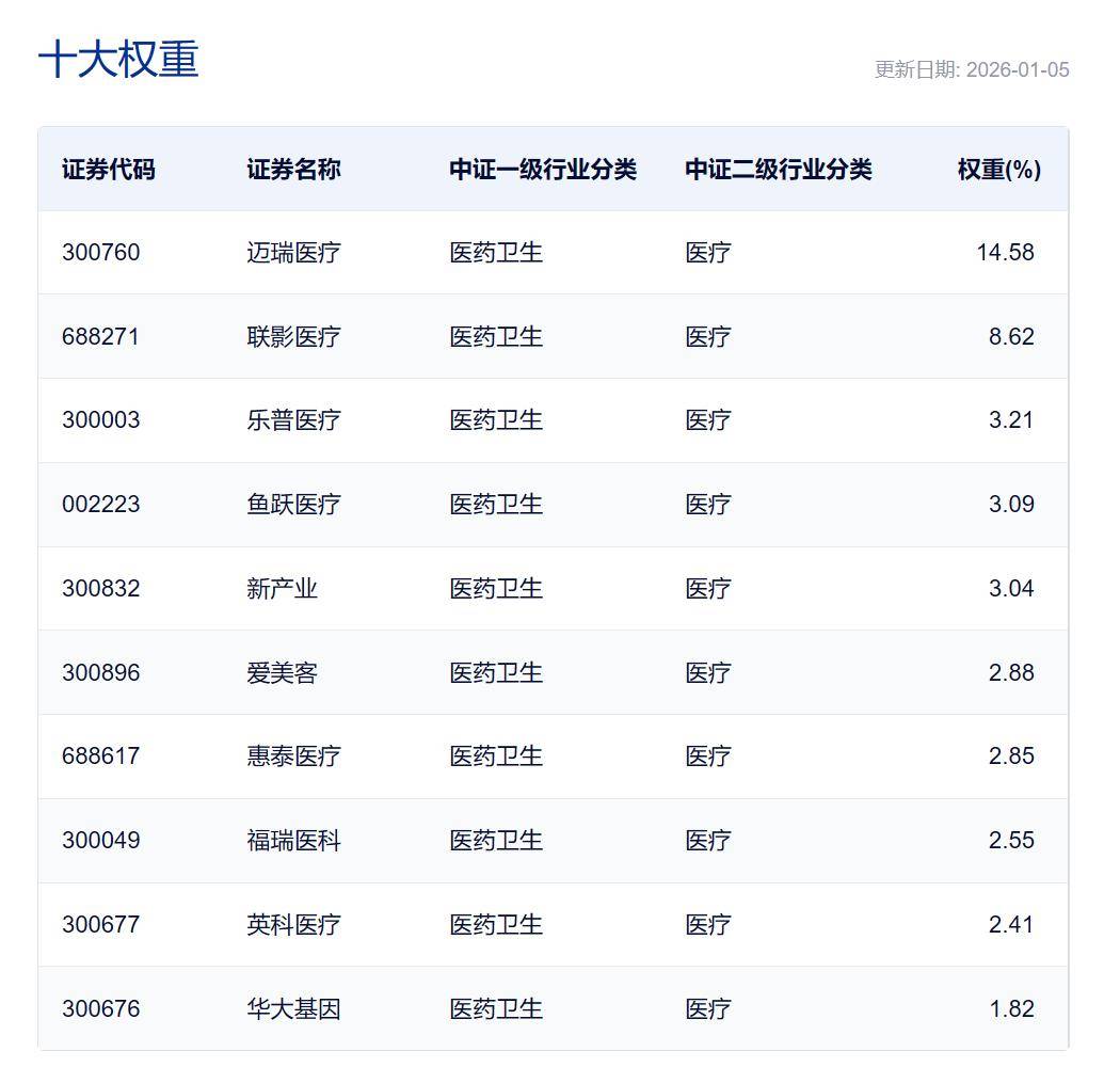 医疗器械指数ETF(159898)精准锚定全市场唯一一只医疗器械指数——中证全指医疗器械(H30217),100%聚焦医疗设备、医疗耗材、体外诊断等医疗细分领域股票,前十大权重股汇聚迈瑞医疗(14.58%)、联影医疗(8.62%)等。