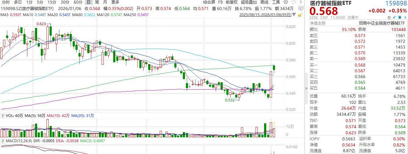今天上证指数高开高走冲击13连阳,脑机接口作为开年硬核赛道之一,继续延续强势。医疗器械指数ETF(159898)高开上涨0.35%,在昨天大阳线的基础上继续上攻,午盘强势吸金1650万。难道拐点真的要来了?