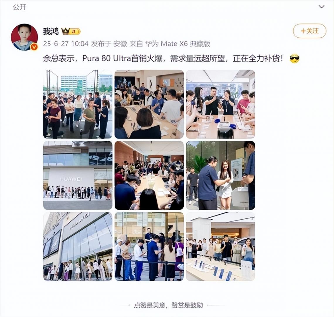 6月27号华为最新款顶级手机Pura 80 Ultra正式开卖,线下门店被挤得水泄不通。上午十点多刚开卖没几分钟,各个型号库存就全没了。据说是线下店人特别多,手机柜台围得里三层外三层,现场工作人员都在喊让大家别往前挤。